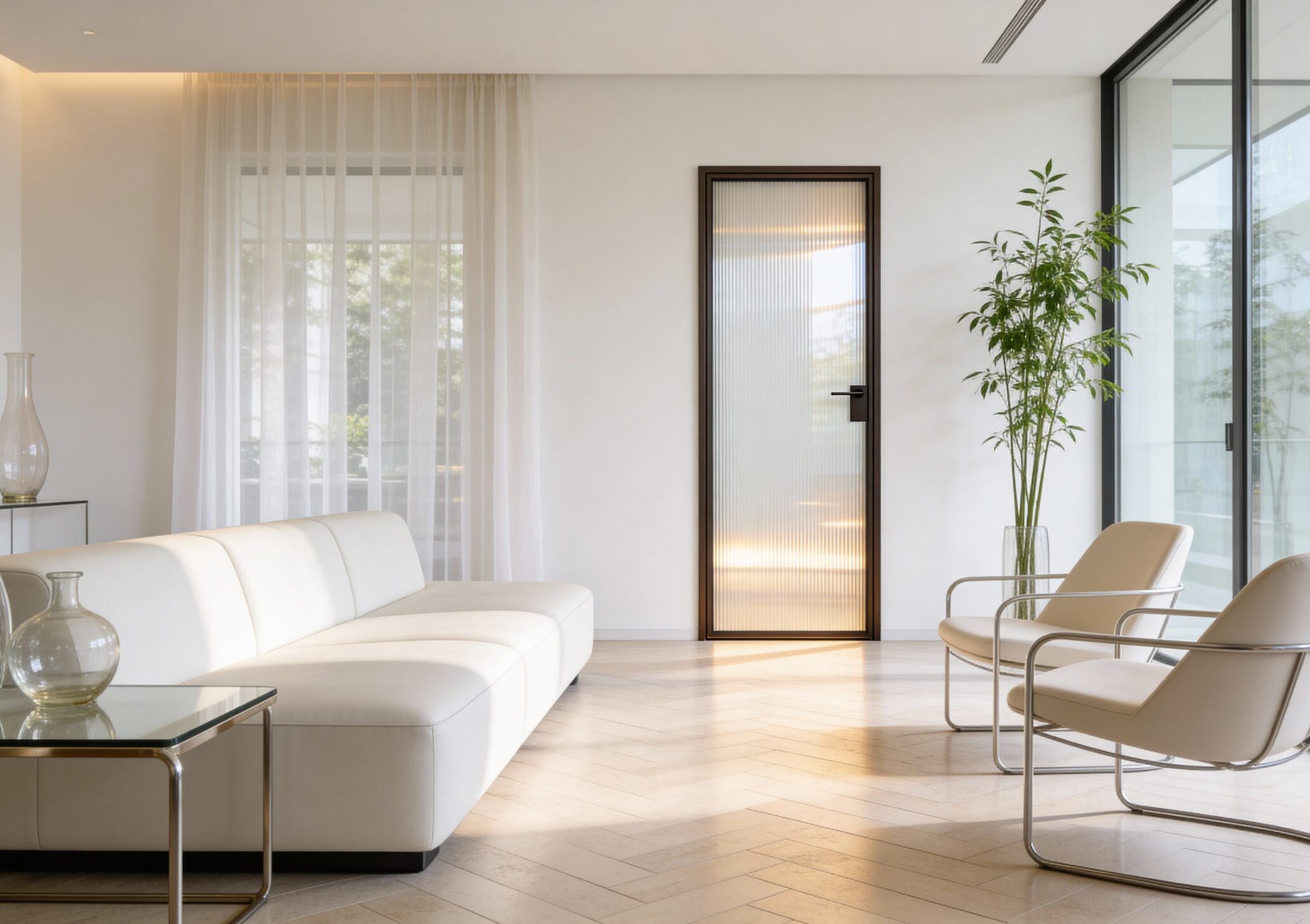 La struttura essenziale valorizza un’ampia gamma di vetri, disponibili in diverse finiture e texture, per soluzioni progettuali versatili e contemporanee.